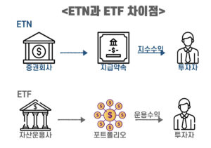 ETF는 자산운용사가 발행하고 운용은 증권사가 하는 반면 ETN은 증권사가 발행하고 운용합니다.